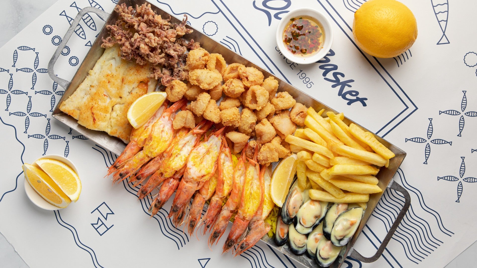 24 Prince Prawns, Calamari, Mussels & Line Fish Cod Fish or Barramundi (share between 4) and served with half chips and half rice.AED 249Platter For 2