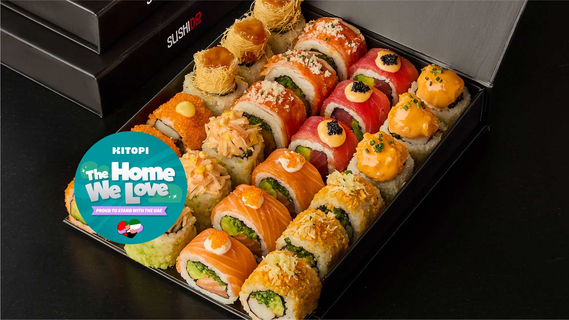 3 Crunchy Shrimp Drip Roll, 3 Crispy California Rolls, 3 Chips Oman Rolls, 3 Avo-Veggie Rolls, 3 Volcano Rolls, 3 Crubby Crumble Roll, 3 Tropical Tempura Rolls and 3 Tropical Blaze RollAED 109