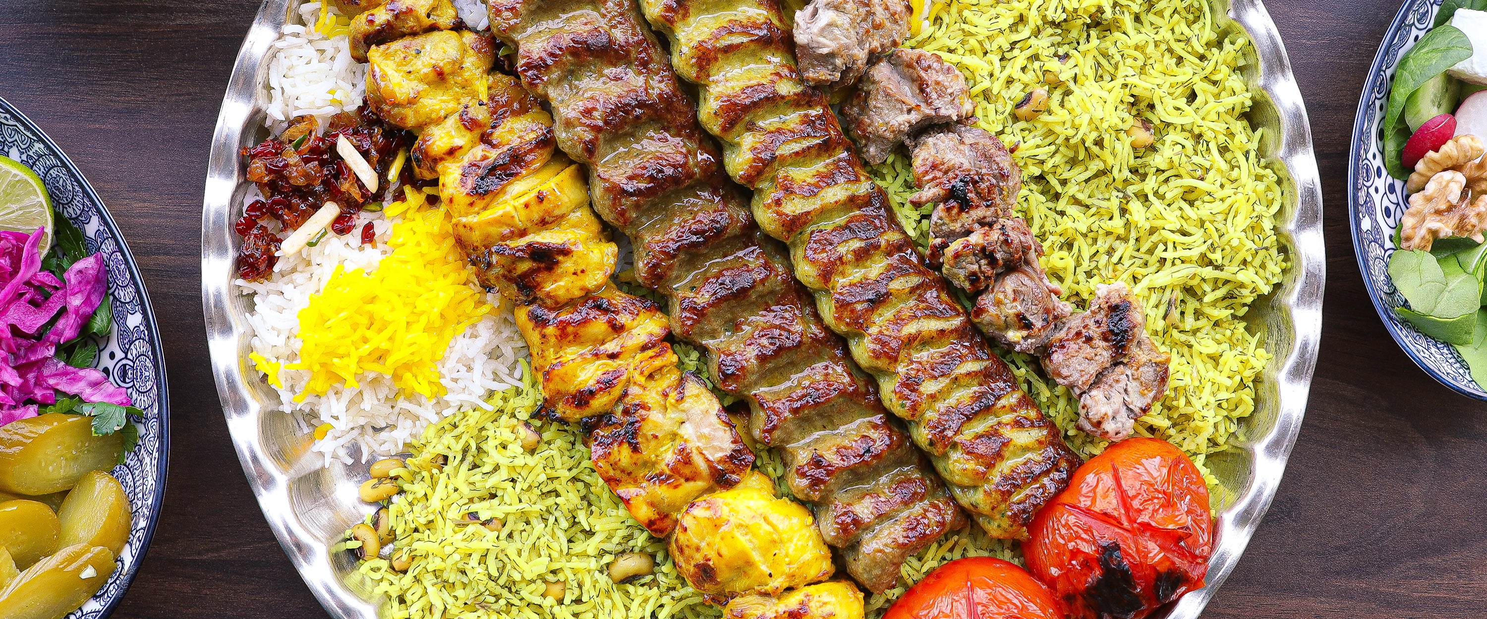 Grilled king fish, baked rice, green rice with beans, saffron rice, barberry, pistachio, wedges potato, salad, tomato, green pepper, onion, sauce, lemon and pickle.AED 78Bakhtiari Kebab