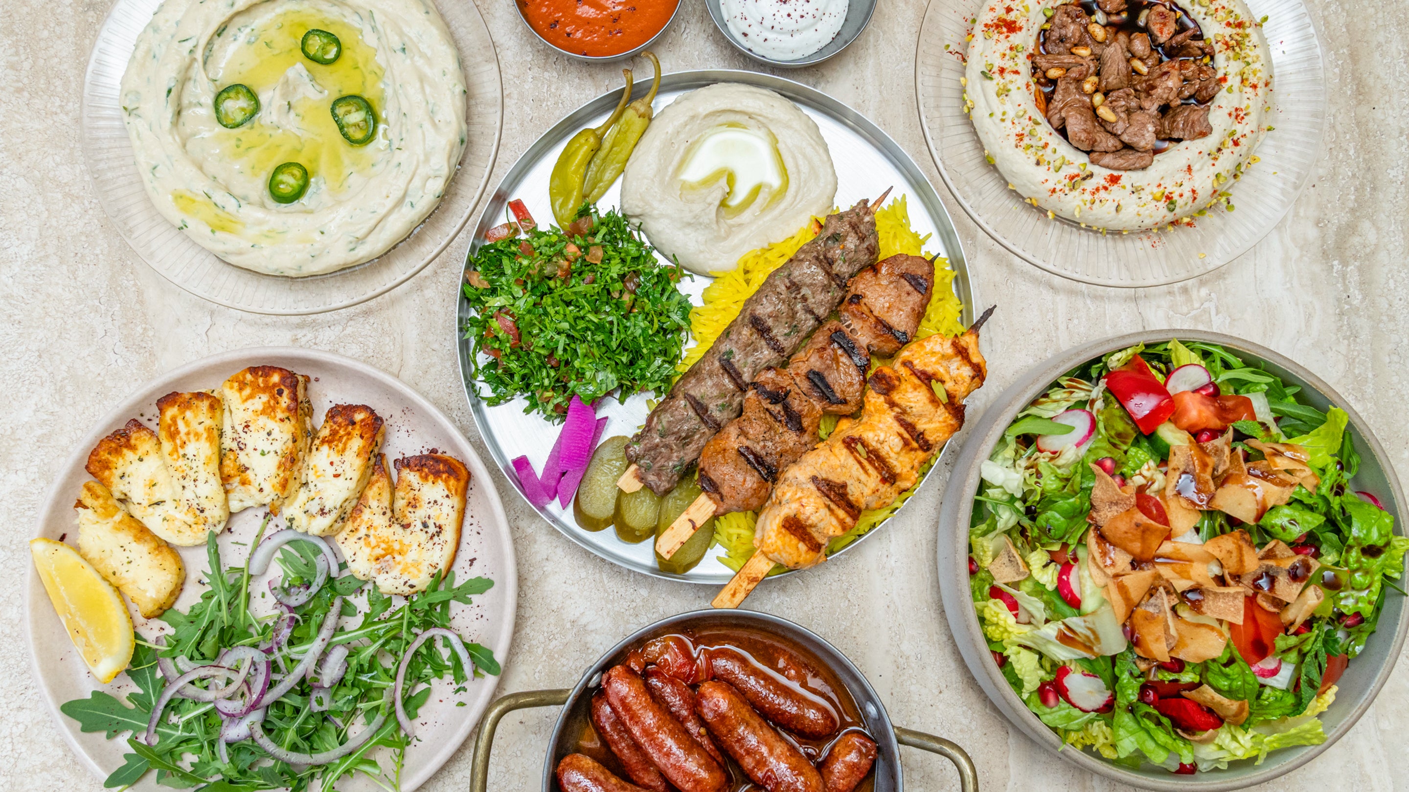 Houmous, moutabal, taboulé, Viande de boeuf, muhammara et battata harra.€20.90