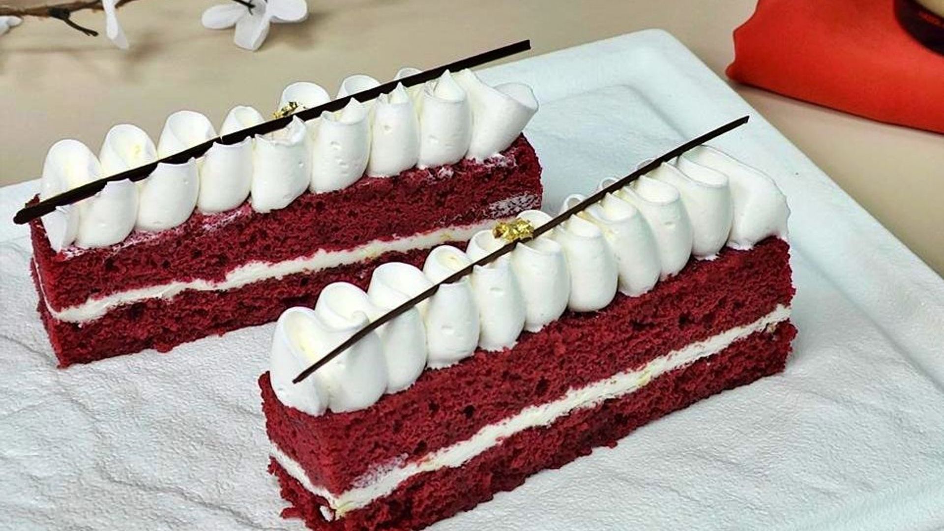Traditional German dark sponge layered with freshly churned cream and juicy maraschino cherries compote covered in chocolate flakes.AED 35RED VELVET VIBES PASTRY (EGGLESS)