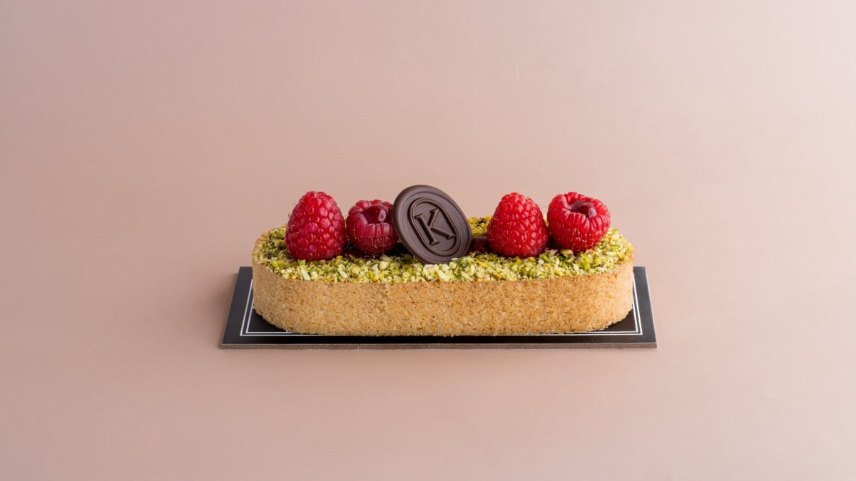 An almond biscuit layered with dark chocolate mousse, raspberry jelly, raspberry cream and red fruits. It is a refined harmony of textures and flavors.Nutritional Values per 100g: 388 Calories | 38.8g Fat | 9.90g Carbs | 0g SugarAED 60VegetarianHazel Dust
