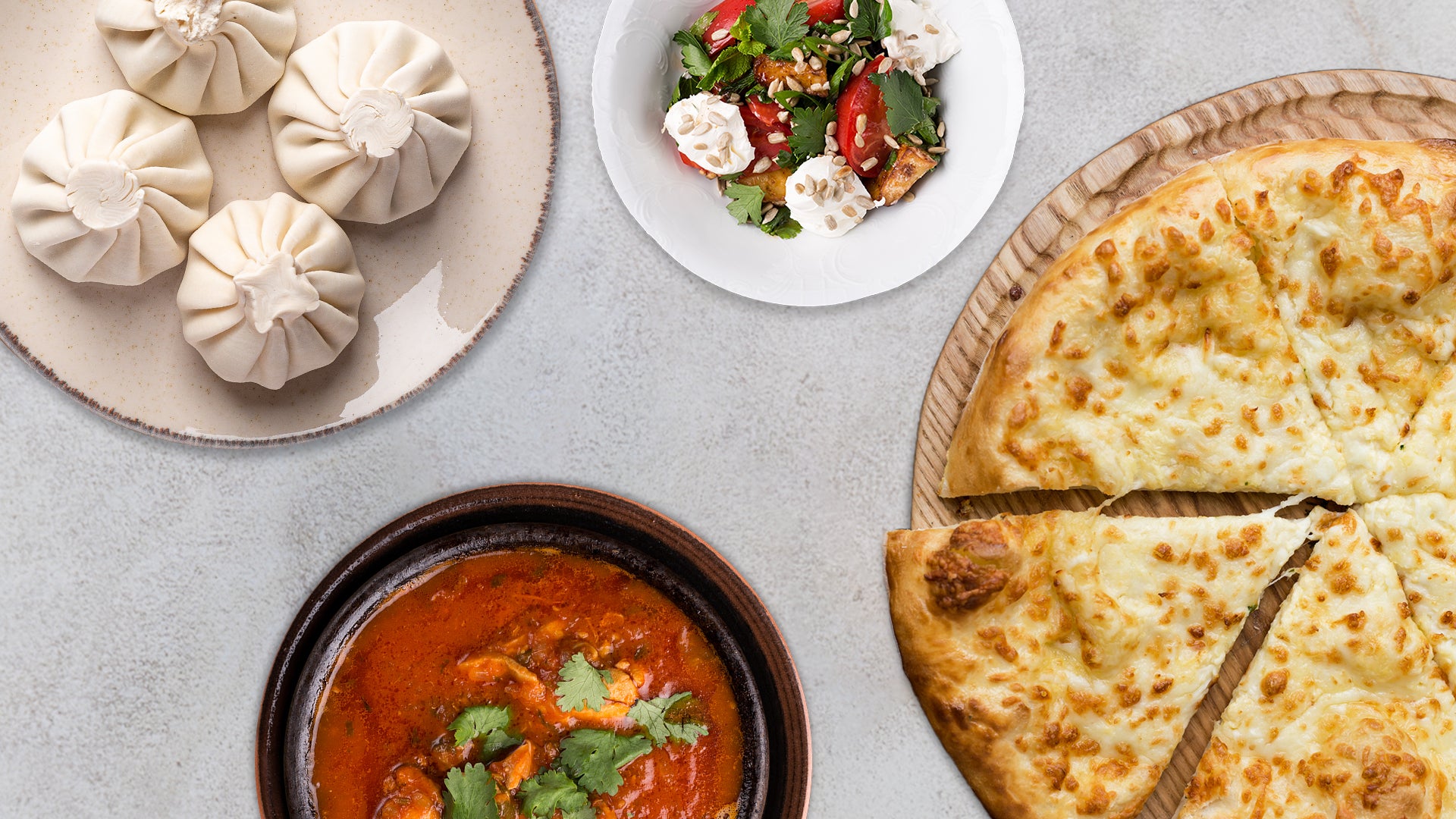 A full Georgian experience for 1/2/4: vegetable Pattie starters, amazing Georgian dumplings Khinkali, delicious cheese pie Khachapuri, spiced chicken mince kebab, fresh marinated vegetables plus Napoleon dessert.