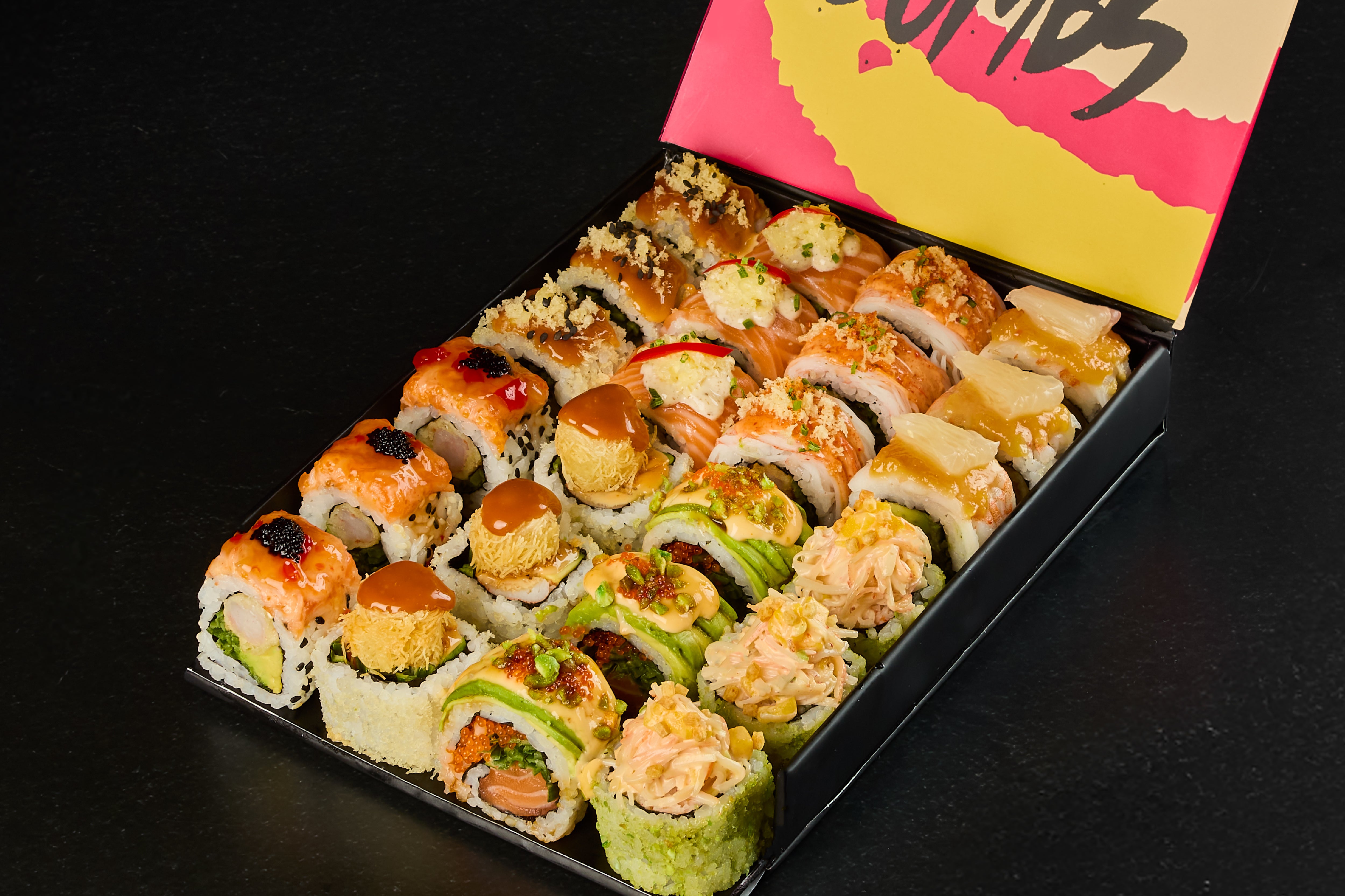 3 Avo Veggie Rolls, 3 Salmon Avocado Rolls, 3 Chickago Rolls, 3 Volcano Rolls, 3 Philadelphia Rolls, 3 Crispy California Rolls, 3 Spicy Tuna Rolls, 3 Chips Oman Rolls, 2 Salmon Sashimi, 2 Tuna Sashimi, 2 Salmon Nigiri, 2 Tuna Nigiri, 2 Ebi Shrimp Nigiri, 3 Salmon Hosomaki, 3 Avo Cheese Hosomaki, 3 Tuna Hosomaki & 3 Shrimp Hosomaki.