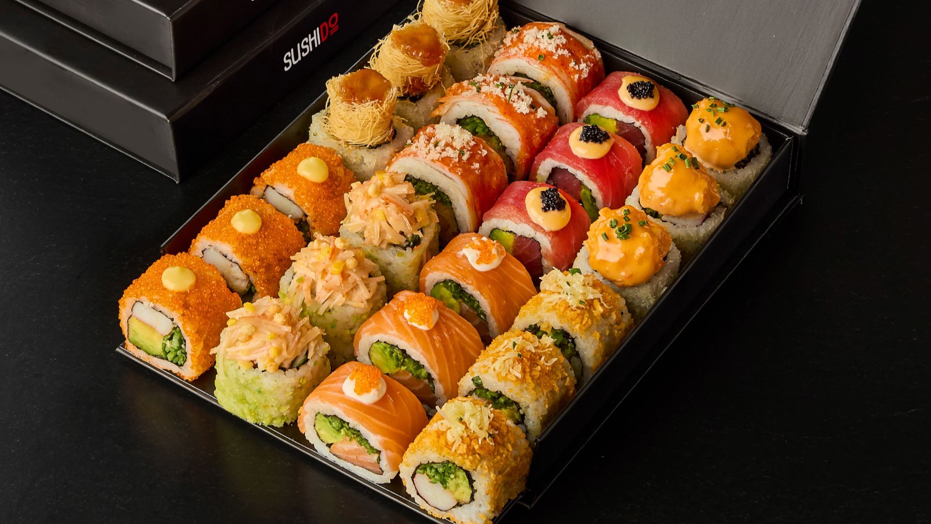 3 Super Shrimp Rolls, 3 Chips Oman Rolls, 3 Philadelphia Rolls, 3 Salmon Drip Rolls, 3 Avo–Veggie Rolls, 3 Salmon Avo Rolls, 3 Chickago Rolls, 3 Volcano Rolls, 3 Crispy California Rolls, 3 Spicy Tuna Rolls, 3 Shrimp Hosomaki, 3 Salmon Hosomaki, 2 Shrimp Nigiri, 2 Salmon Nigiri.AED 246