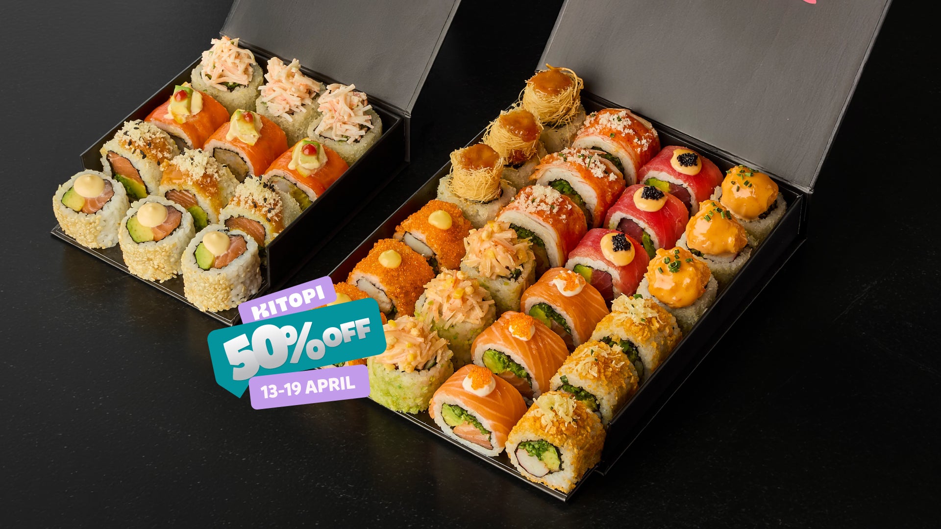 3 Crunchy Shrimp Drip Roll, 3 Crispy California Rolls, 3 Chips Oman Rolls, 3 Avo-Veggie Rolls, 3 Volcano Rolls, 3 Crubby Crumble Roll, 3 Tropical Tempura Rolls and 3 Tropical Blaze RollAED 109