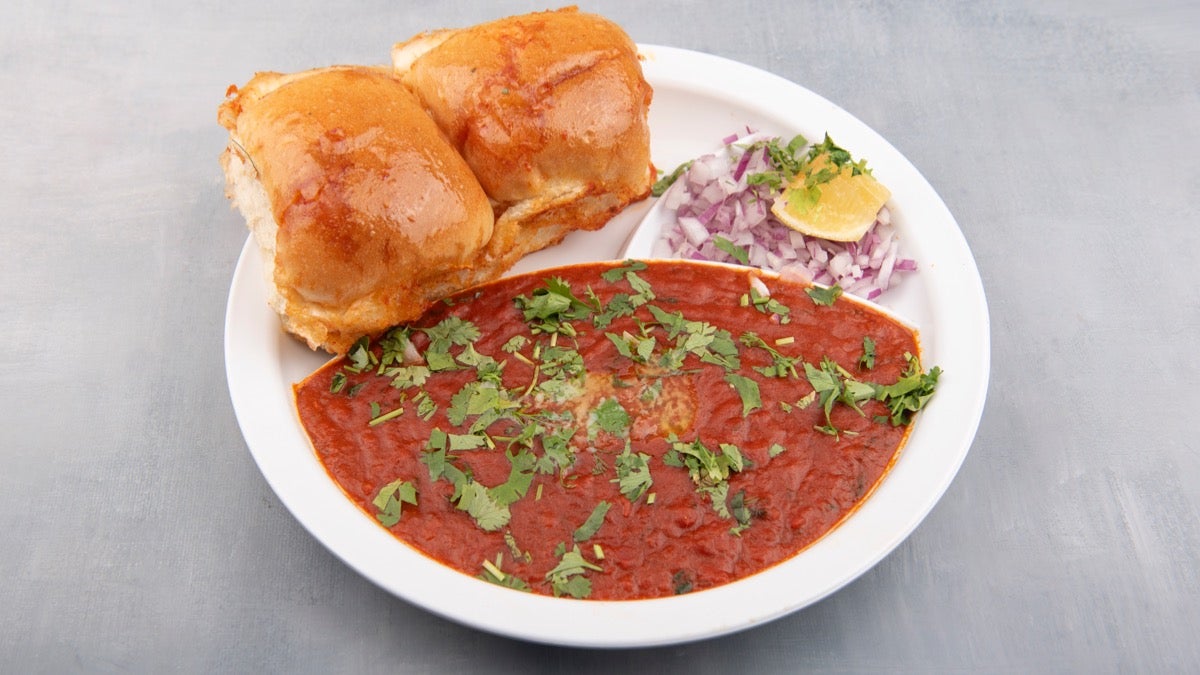Misal spiced sprouted beans curry with farsan, Pav bread rollsAED 18Pav Bhaji