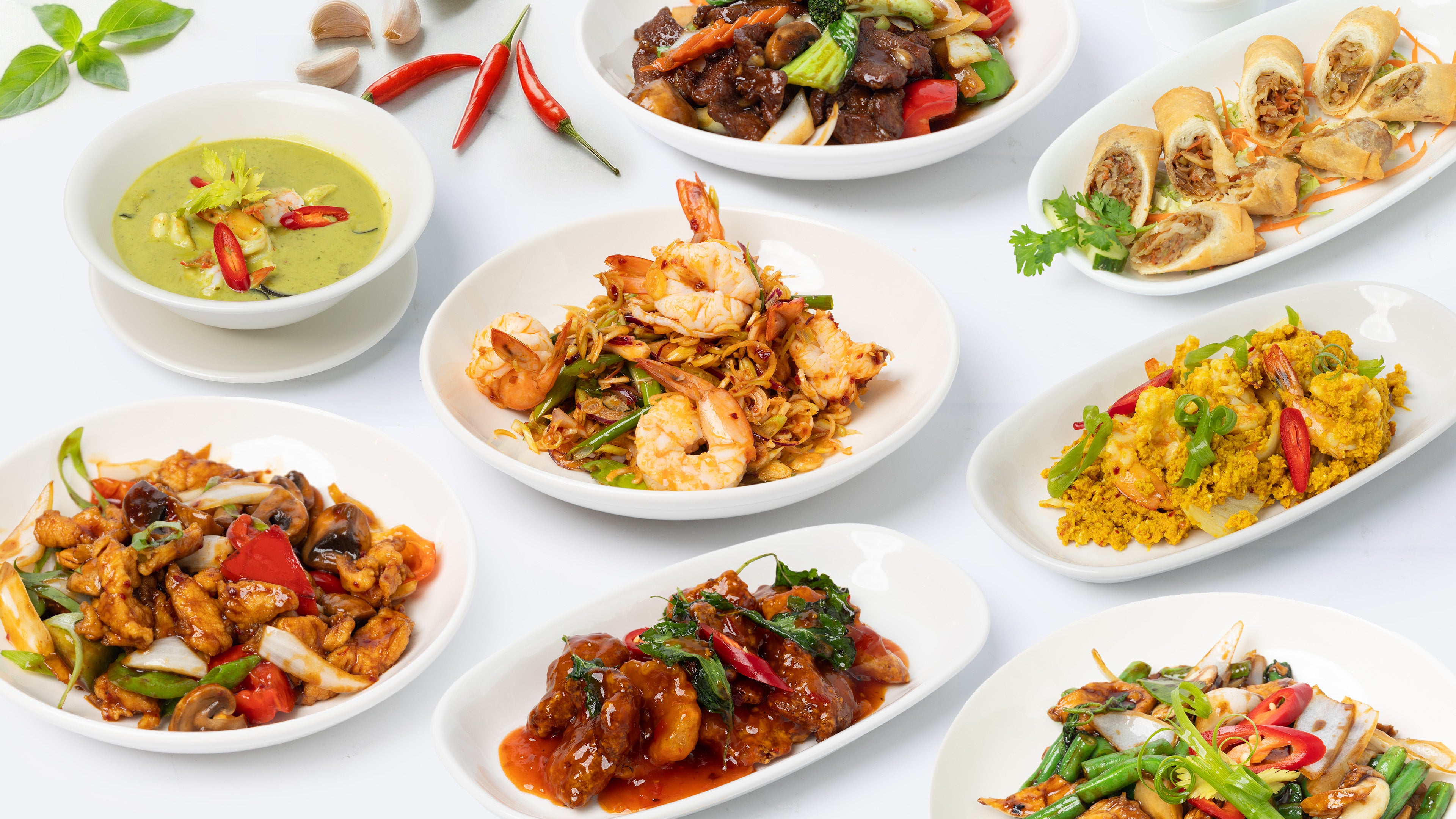 2 Pcs Chicken Spring Roll + Steamed Jasmine Rice + Chicken with Penang Curry Red Curry Green Curry Choice of DrinkAED 392 Chicken Spring Roll , Stir fried Chicken in Chili Paste OR Cashew Nut , Egg fried rice , Choice of Drink