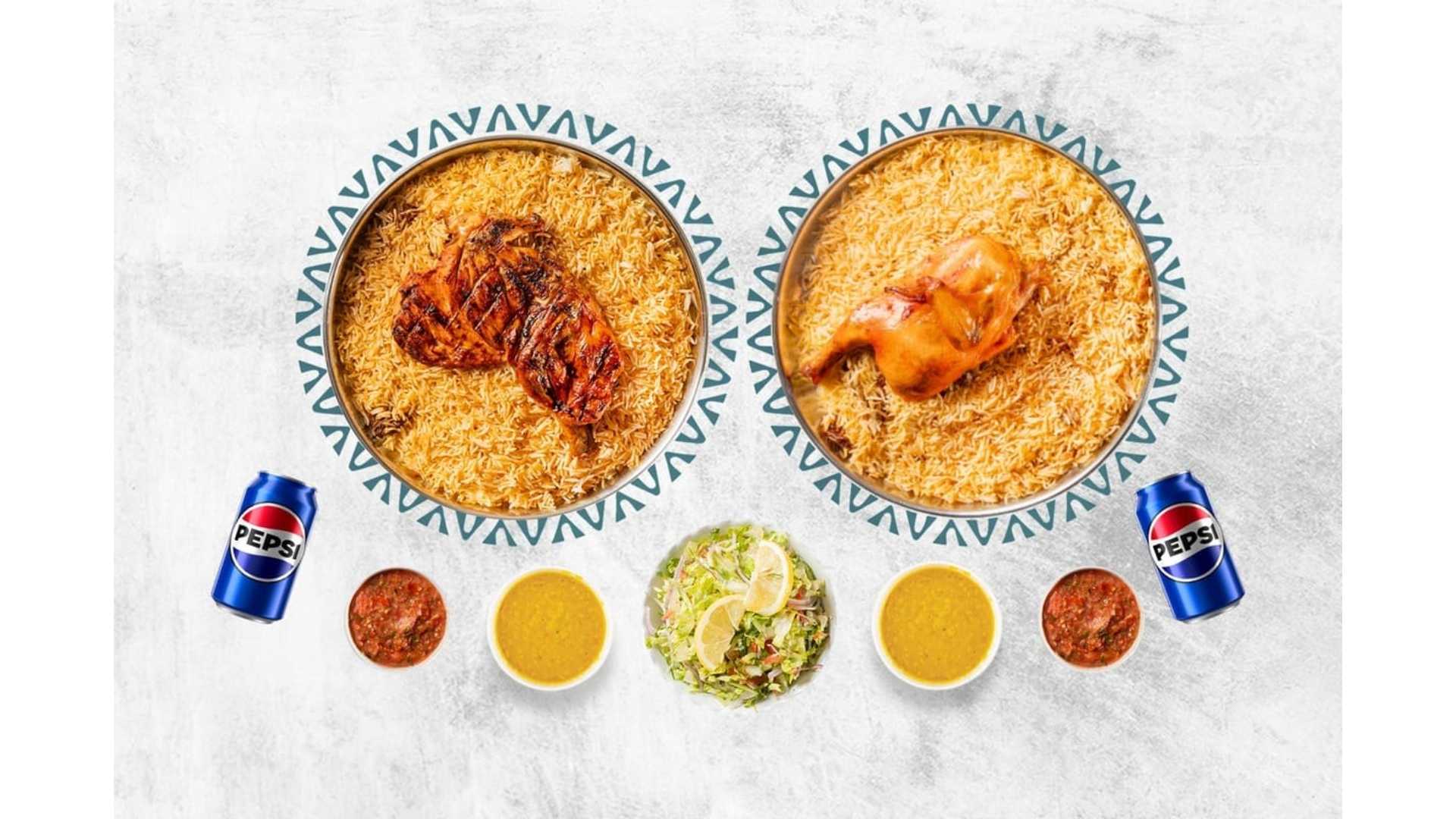 2 Half chicken, 2 meat, mutable eggplant, salad, 4 pieces fried kibbeh meat, 4 meat soup and 4 mandi sauce.AED 250