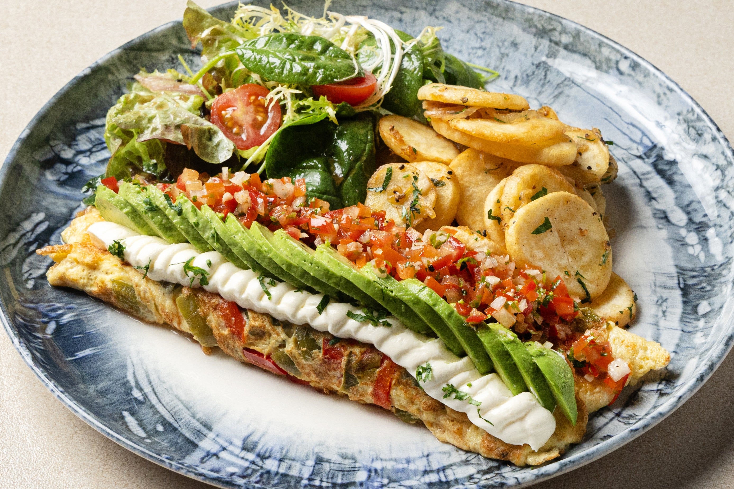 All our Omelettes are made with three Omega-3 Eggs and served with Lyonnaise-style potatoes and mixed greens